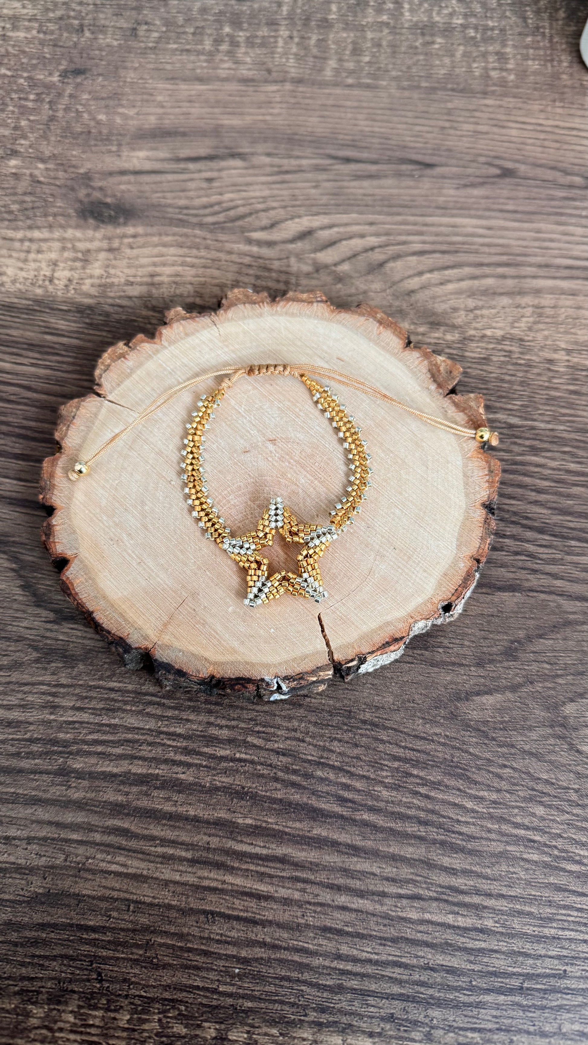 La pulsera Abril es una pieza de declaración tejida a mano con un diseño intrincado que simula ondas o encaje. Combina microcuentas transparentes iridiscentes 🤍 con detalles dorados ✨ para un efecto deslumbrante que captura la luz. Su tejido ancho y el cierre ajustable de macramé la hacen cómoda y perfecta para cualquier tamaño de muñeca. Un accesorio sofisticado que aporta textura y brillo a tu look de día o de noche.