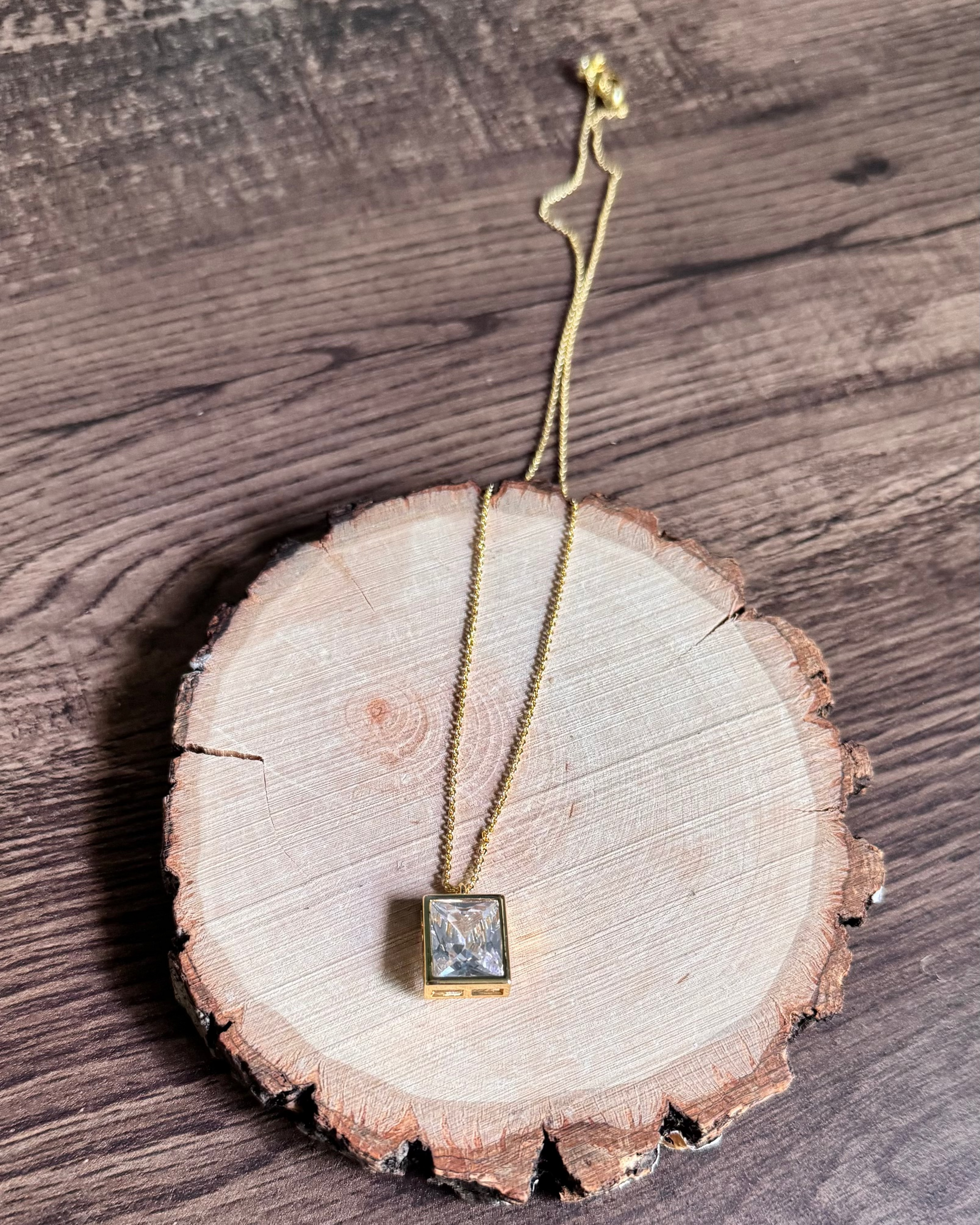El collar Auren combina una delicada cadena dorada con un dije cuadrado de cristal brillante que refleja la luz con cada movimiento. Su diseño minimalista y moderno lo convierte en un accesorio imprescindible para elevar cualquier look.