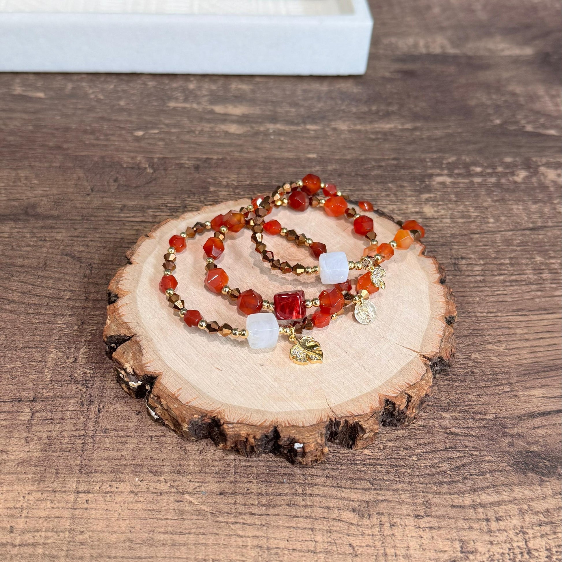 El set de pulseras Daniela captura la vitalidad del sol y la energía terrenal ☀️. Este conjunto de stacking presenta una mezcla rica en cuentas facetadas de tonos vibrantes naranja y ámbar 🧡, acentuadas con detalles dorados y llamativos cubos blancos que añaden un contraste moderno. Incluye pequeños dijes dorados que le dan un toque juguetón. Es el accesorio ideal para darle color y brillo a tu muñeca.