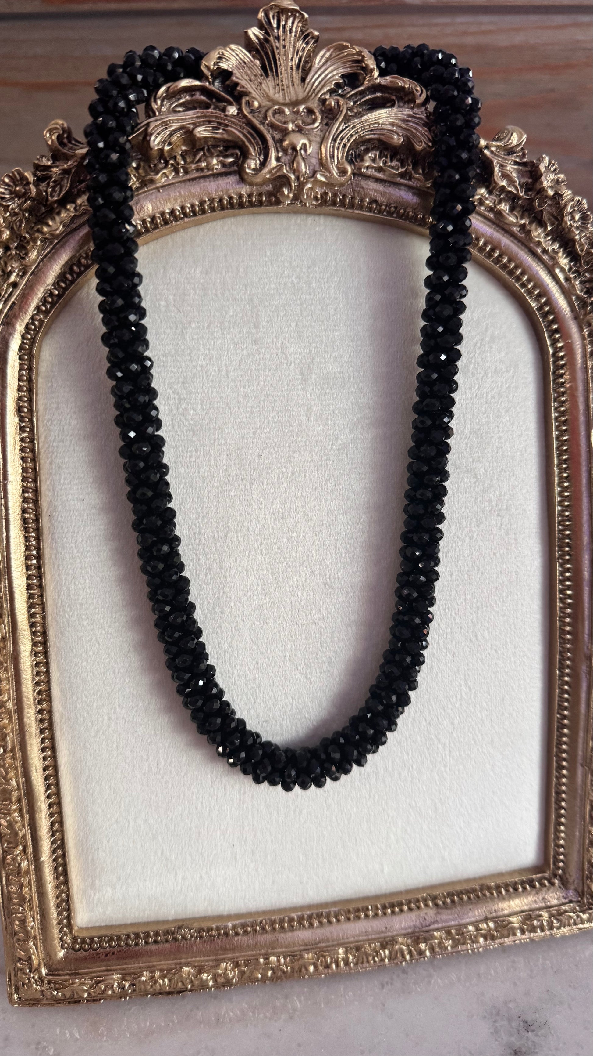 Su diseño está hecho con cristales negros facetados que reflejan la luz de manera sutil y elegante, creando un brillo sofisticado que transforma cualquier look.