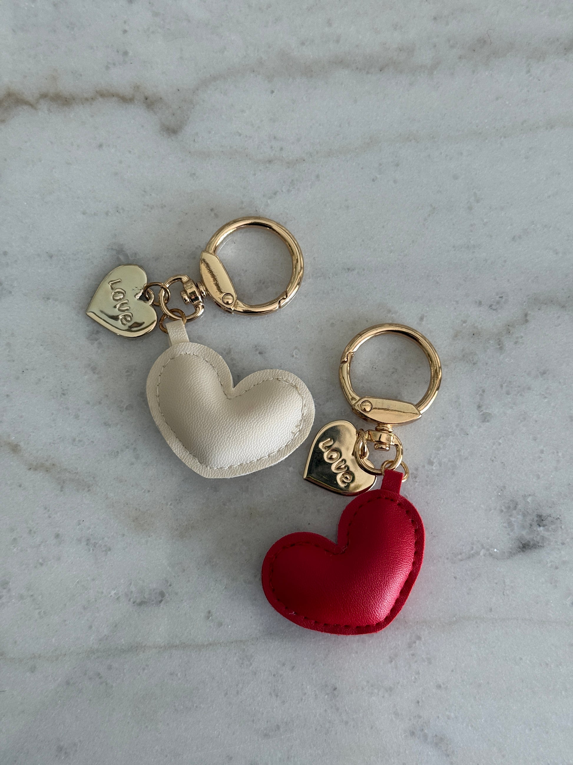 Es un llavero con corazón acolchado y un dije metálico con la palabra “Love”, perfecto para darle un toque lindo a tus llaves, cartera o bolso.