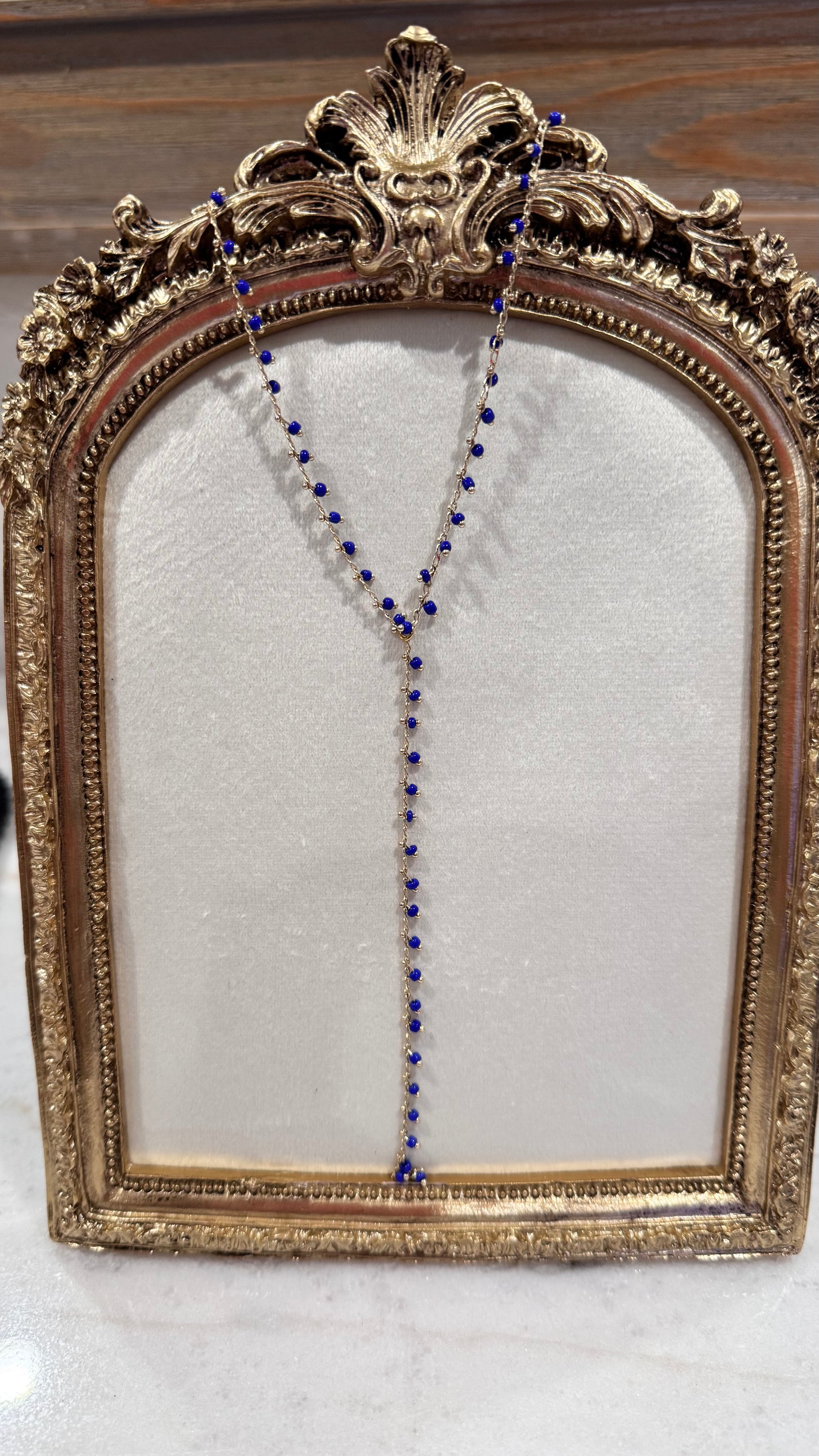 Su diseño tipo “Y” estiliza visualmente y cae con una suavidad hermosa gracias a la cadena plateada decorada con pequeños cristales azules que aportan brillo y profundidad.