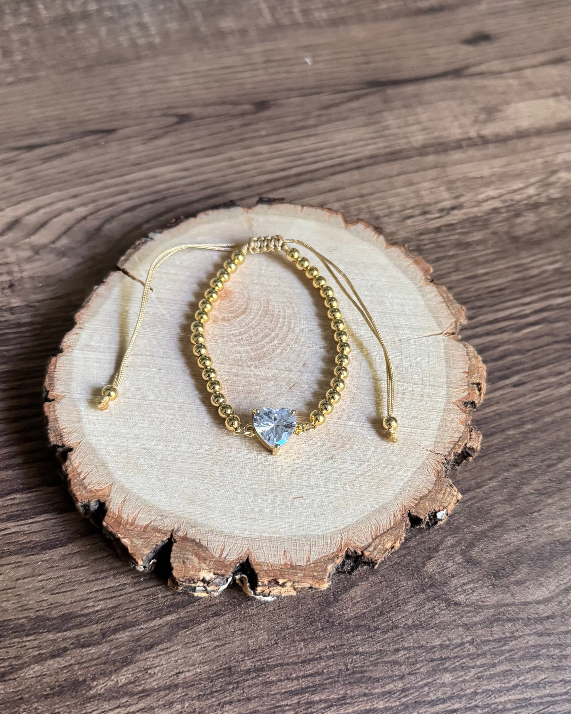La pulsera Maia combina la calidez de las cuentas doradas con un corazón cristalino que refleja pureza, amor y buena energía.