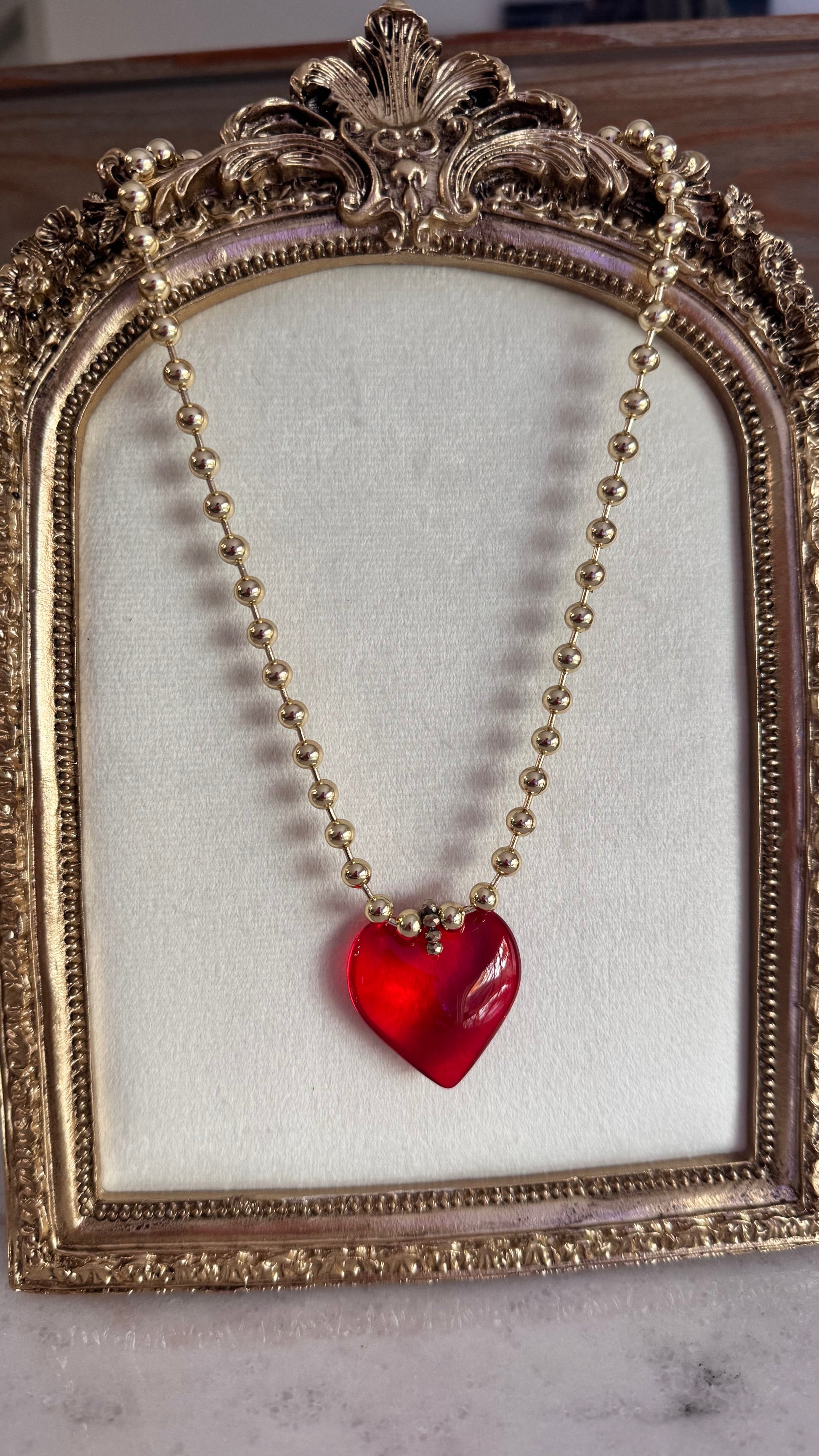 Su cadena de cuentas doradas sostiene un corazón rojo intenso que se convierte en el protagonista absoluto: una pieza que transmite pasión, dulzura y esa energía linda que nunca pasa desapercibida.