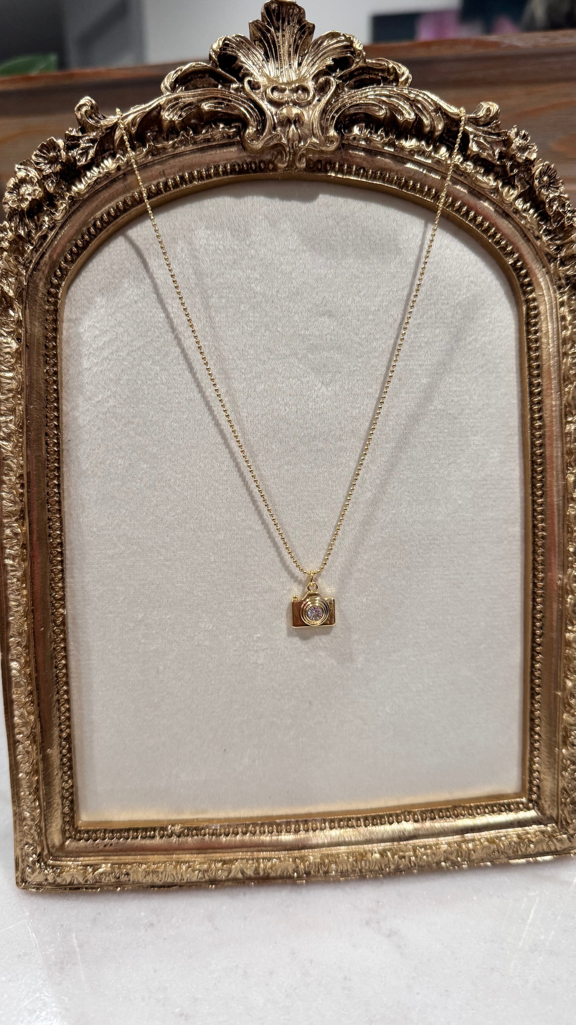 Su cadena dorada sostiene una delicada cámara con un brillo sutil que aporta un toque artístico y femenino.