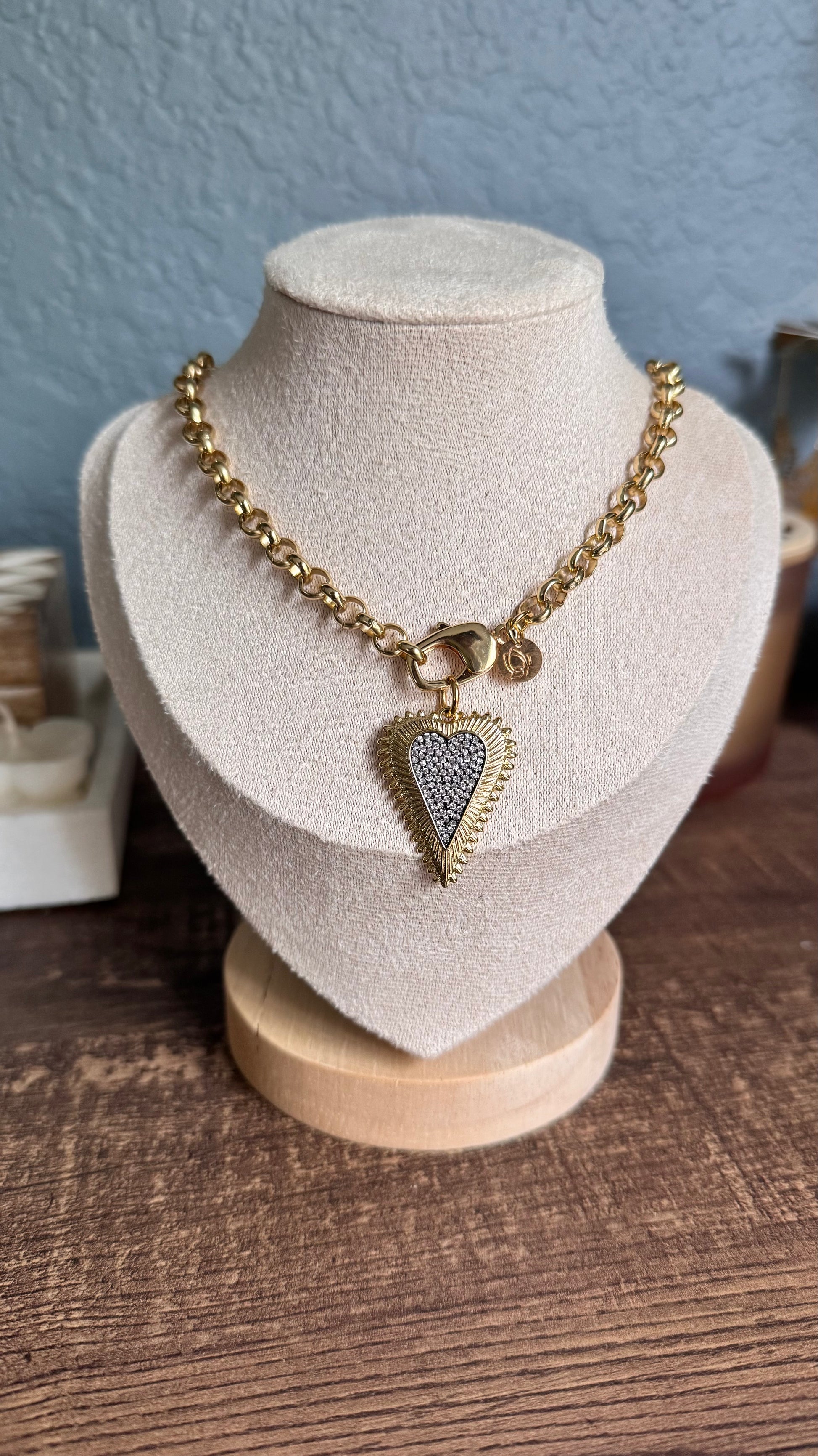 Un accesorio que transmite poder, energía y mucha personalidad✨. El collar Solange combina una cadena de eslabones con un broche que va sumado a un corazón vibrante con zircones en color metálico. Este collar tiene la bondad de ser versátil , donde lo usas acompañado o simplemente solo.