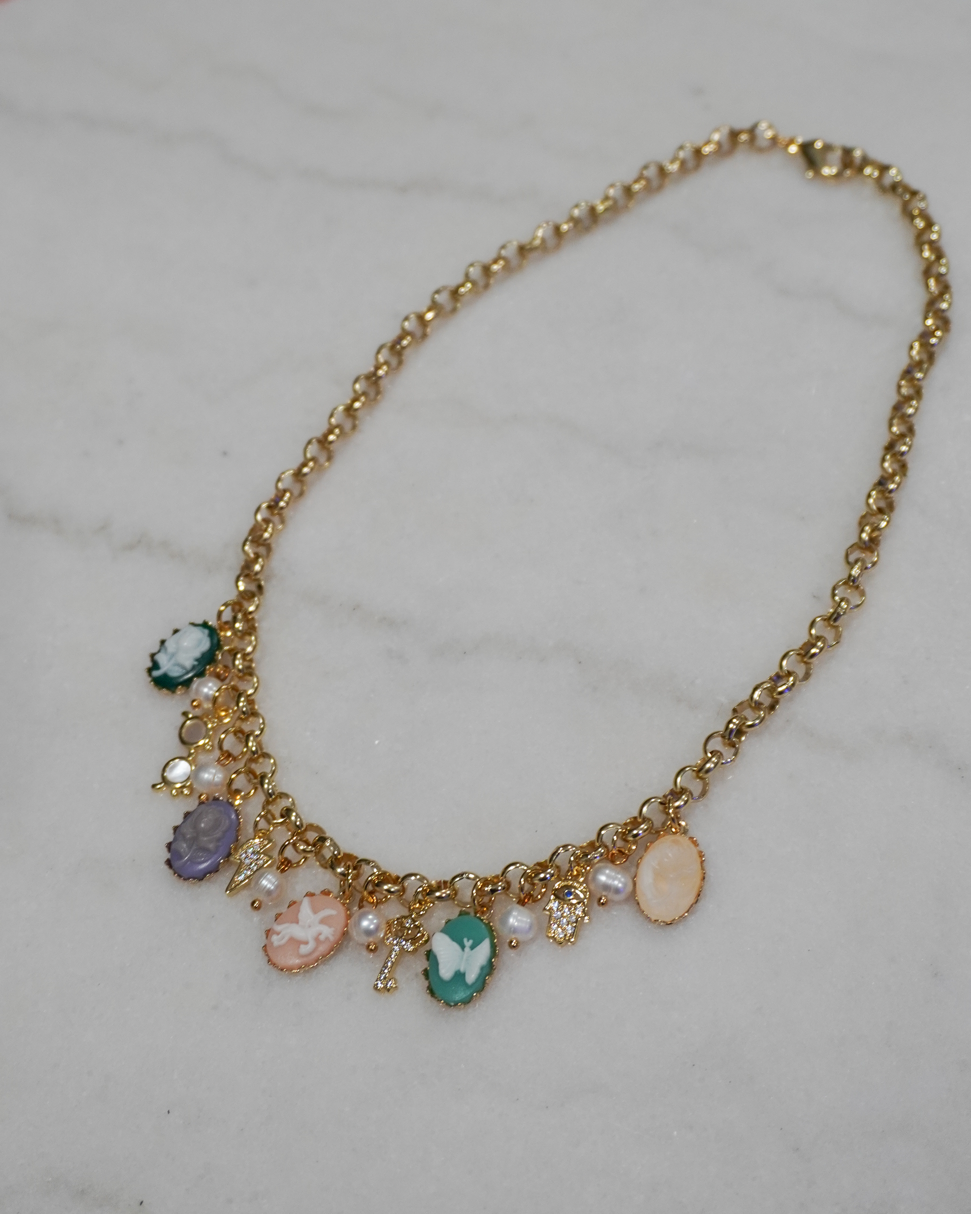 Un collar lleno de historia y detalles que enamoran. Victoria combina camafeos en tonos suaves, perlas y dijes delicados para crear una pieza femenina, romántica y con un encanto atemporal.