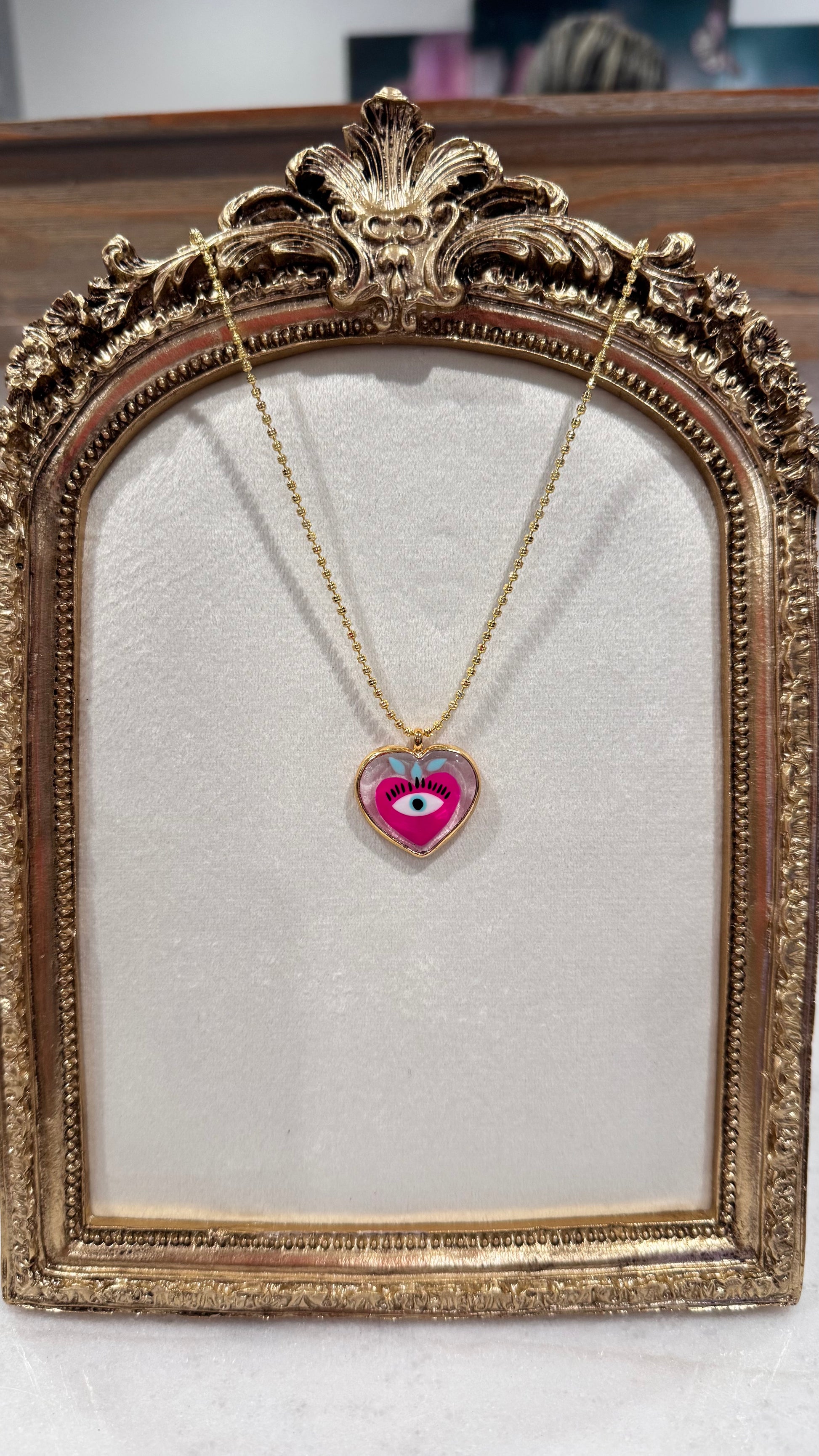 Su cadena dorada sostiene un corazón rosa vibrante con un ojito protegido en su interior, creando un diseño moderno, llamativo y súper especial.